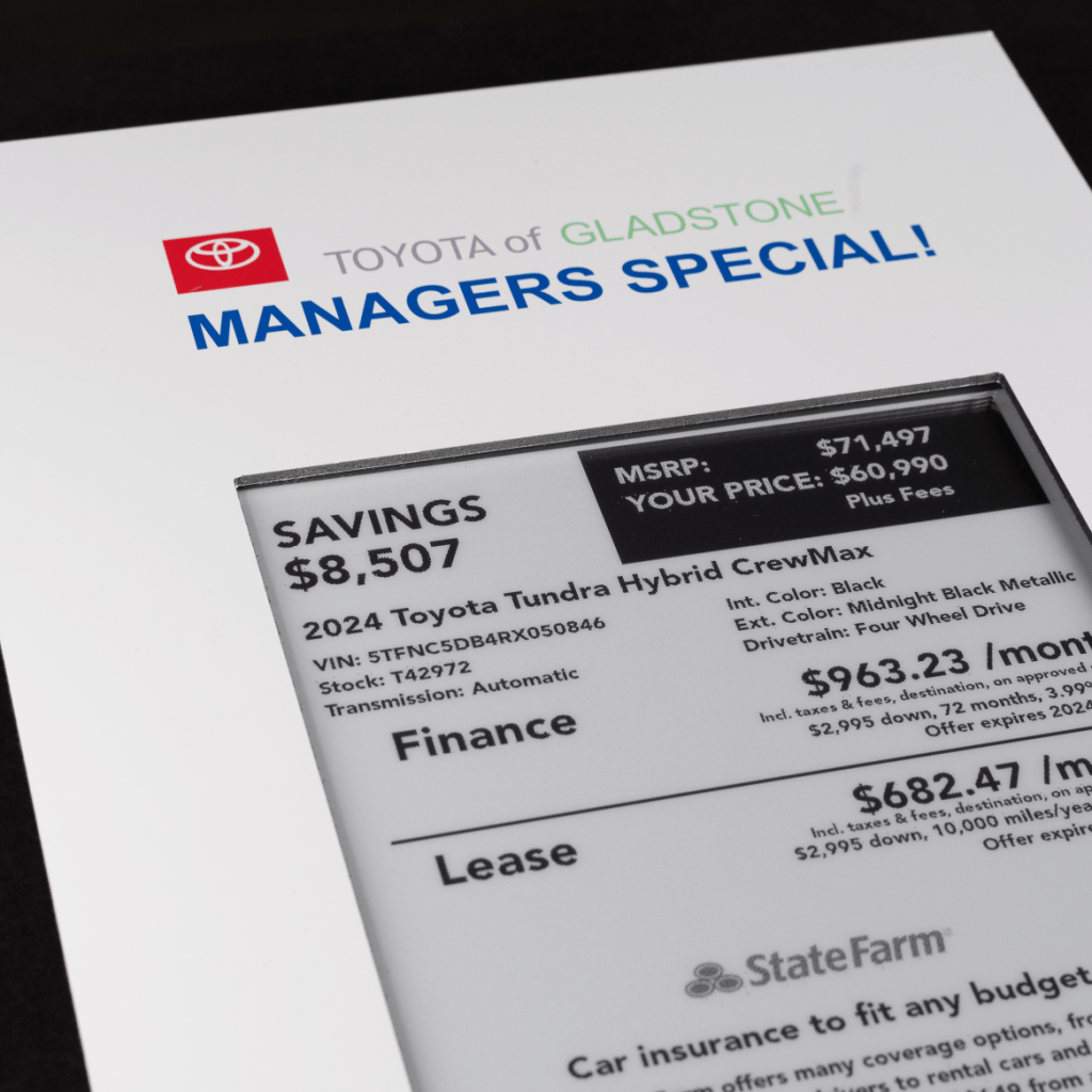 Our cloud-connected digital price tags integrate with your modern retail platform, inventory, and website, automatically updating prices with dealer discounts or manufacturer rebates for accurate online and on-lot pricing.